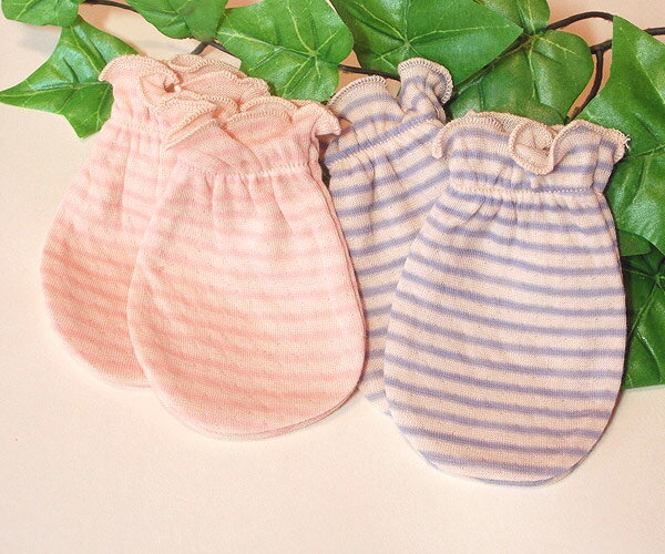 お出掛け着に合わせやすいブルーとピンク このベビーミトンは、外出時の上着などに合わせやすいブルーとピンクの草木染めオーガニックコットンです。