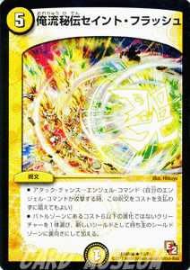 デュエルマスターズ カード エピソード2 第2弾 ビクトリー・ラッシュ(DMR06)収録 デュエルマスターズ カード 俺流秘伝セイント・フラッシュ ■レアリティ:アンコモン ■種類:呪文 ■文明:光文明 ■コスト:(5) [特殊能力] アタック・チャンス-エンジェル・コマンド(自分のエンジェル・コマンドが攻撃する時、この呪文をコストを支払わずに唱えてもよい) バトルゾーンにあるコスト6以下の進化ではないクリーチャーを1体選び、新しいシールドとして持ち主のシールドゾーンに裏向きにして加える。