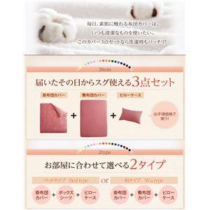 このカバー3点セットなら洗濯時もバッチリ!届いたその日からスグ使える3点セット掛布団カバー+敷布団カバー+ピローケースお部屋に合わせて選べる2タイプベッドタイプ掛け布団カバー+ボックスシーツ+ピローケース和タイプ掛け布団カバー+敷布団カバー+ピローケースぴったりが選べる!5サイズ展開シングルサイズ セミダブルサイズ ダブルサイズクイーンサイズ キングサイズ ※ダブル、クイーン、キングサイズはピローケースが2枚付き、 4点セットとなります。